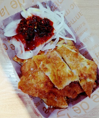 6. 접시에 육전 올리고, 채 썬 양파에 간장 양념소스까지 뿌리면 완성.