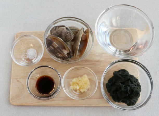 재료: 바지락 5개, 매생이 50g, 다진 마늘 ½작은술, 국간장 ½작은술, 참기름 ½작은술, 소금 1꼬집, 물 1컵
